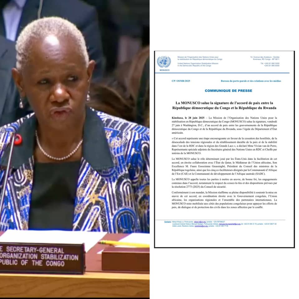 Kinshasa, 28 juin 2025 — La Mission des Nations unies pour la stabilisation en République démocratique du Congo (MONUSCO) a salué, ce samedi, la signature