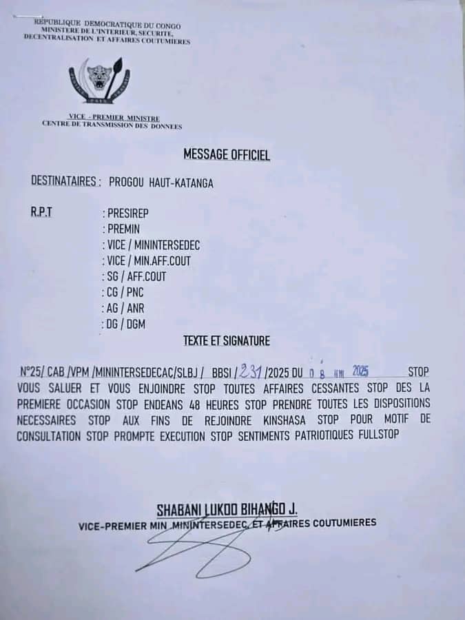 Kinshasa, 8 juillet 2025 – Le gouverneur du Haut-Katanga, Jacques Kyabula, a été convoqué à Kinshasa pour consultation par le vice-Premier ministre en charge de