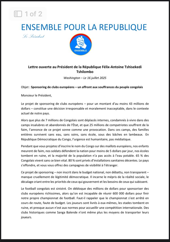 Dans une lettre ouverte adressée ce mercredi 16 juillet au président Félix Tshisekedi, le mouvement Ensemble pour la République a vivement critiqué un projet de