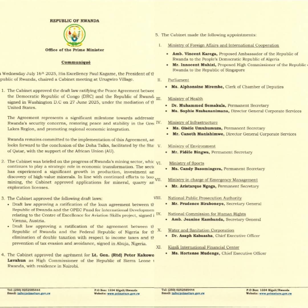 Le gouvernement rwandais a officiellement ratifié l’accord de paix signé le 27 juin 2025 à Washington avec la République démocratique du Congo, sous médiation des