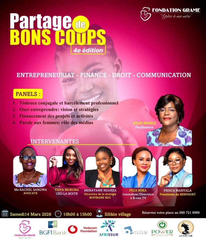 La Fondation Grâce à ma mère (GRAME) convie le public à la 4e édition de « Partage de bons coups », qui se tiendra le samedi 14 mars 2026 à partir de 10h au Silikin Village à Kinshasa. Cet événement rassemblera des professionnelles issues du droit, de la finance, des médias et de l’entrepreneuriat pour aborder des thématiques liées à l’autonomisation et au leadership féminin.